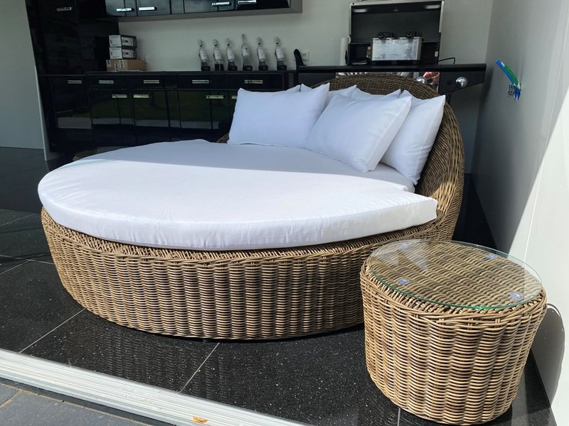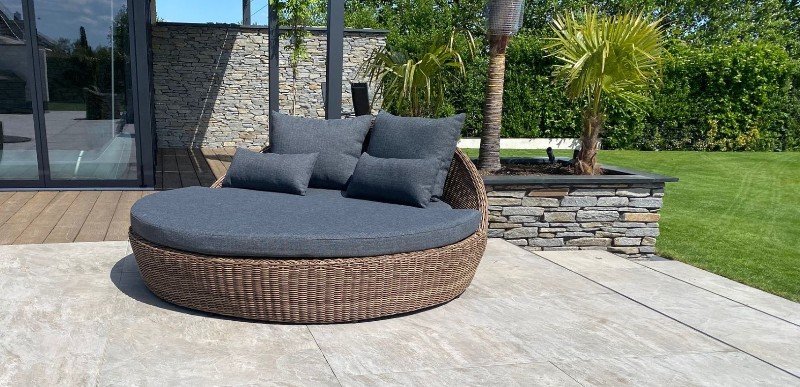 Groot rond ligbed Antibes in een modern design! Deze kingsize sunlounger is gemaakt van stevig en weerbestendig wicker. Het wicker is in diverse kleuren verkrijgbaar. Ook is een bijbehorende bijzettafel leverbaar voorzien van een geharde glasplaat. Het ligbed Antibes heeft een groot passend ligkussen van 10 cm dikte en wordt ook geleverd met 2 rugkussens en 4 losse sierkussens. De kussen zijn allweather kussens, uitwasbaar en leverbaar in vele kleuren.