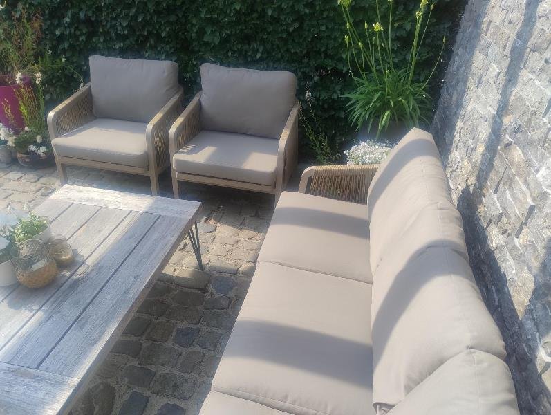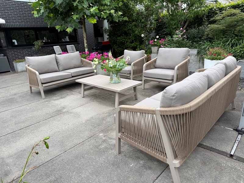 Luxe zeer uitgebreide loungeset gemaakt van stevig en weerbestendig aluminium frame. De zijkanten zijn afgewerkt met ropesDe set kan ook naar eigen wens worden samengesteld. De set als vermeld is de standaard uitvoering.