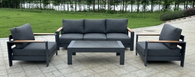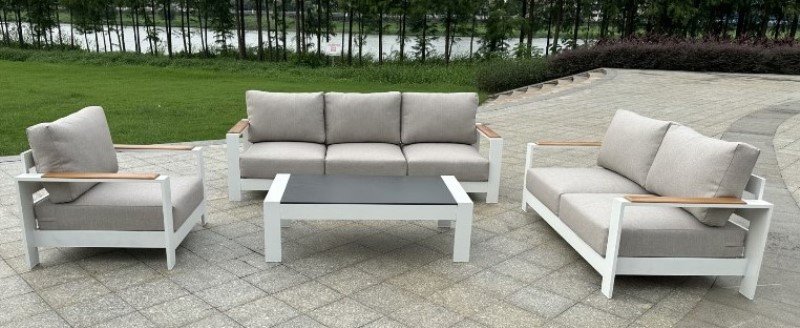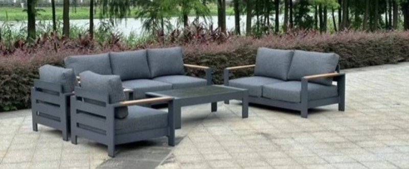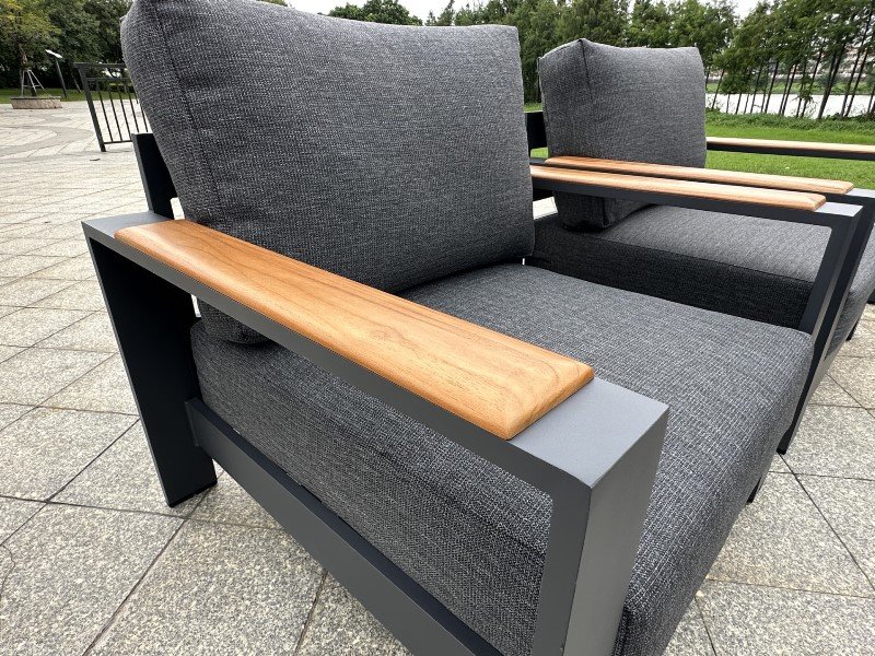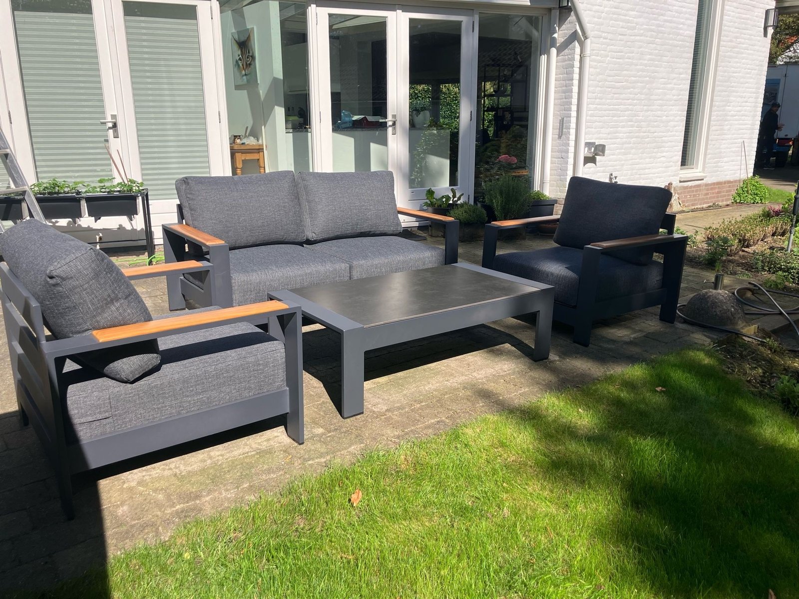 Luxe zeer uitgebreide loungeset gemaakt van een robuust aluminium frame. De leuningen zijn afgewerkt met teak. De set kan ook naar eigen wens worden samengesteld. De set als vermeld is de standaard uitvoering.