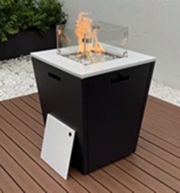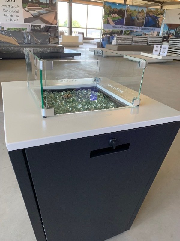 Deze vierkante vuurtafel heeft een antraciet onderstel. De klep is wit en heeft een vuurvaste glazen scheidingswand. Deze vuurtafel kan ook in het wit of antraciet worden besteld. Deze vuurtafel wordt altijd exclusief gasfles geleverd.